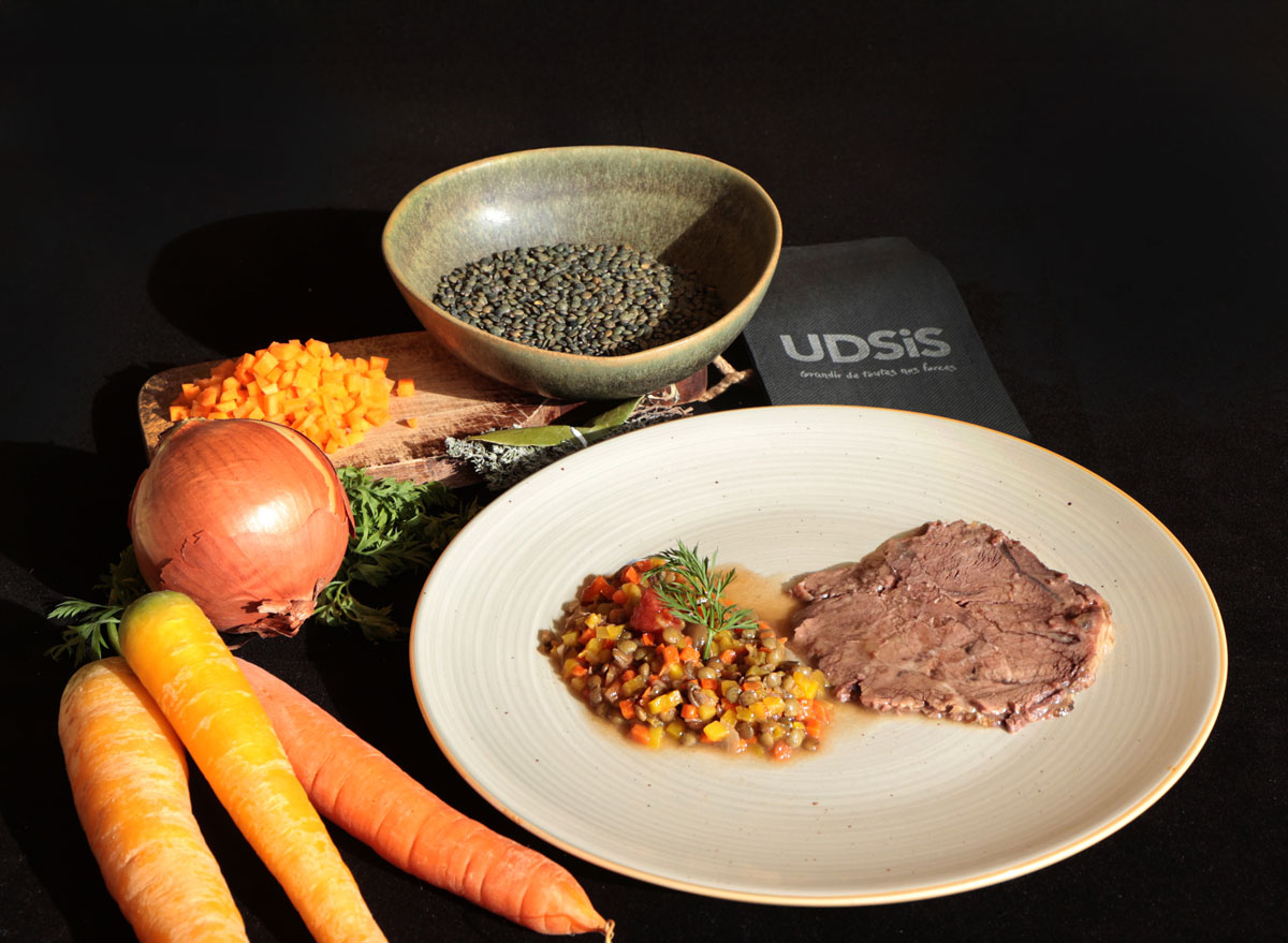 Conformément aux préconisations de la Loi Egalim, l’U.D.S.I.S. propose un menu végétarien à l’ensemble de ses convives une fois par semaine. Les menus végétariens sont composés d’apport en protéines végétales (association de féculents et légumineuses), de légumes cuits, de crudités (entrée ou dessert) et de produits laitiers.